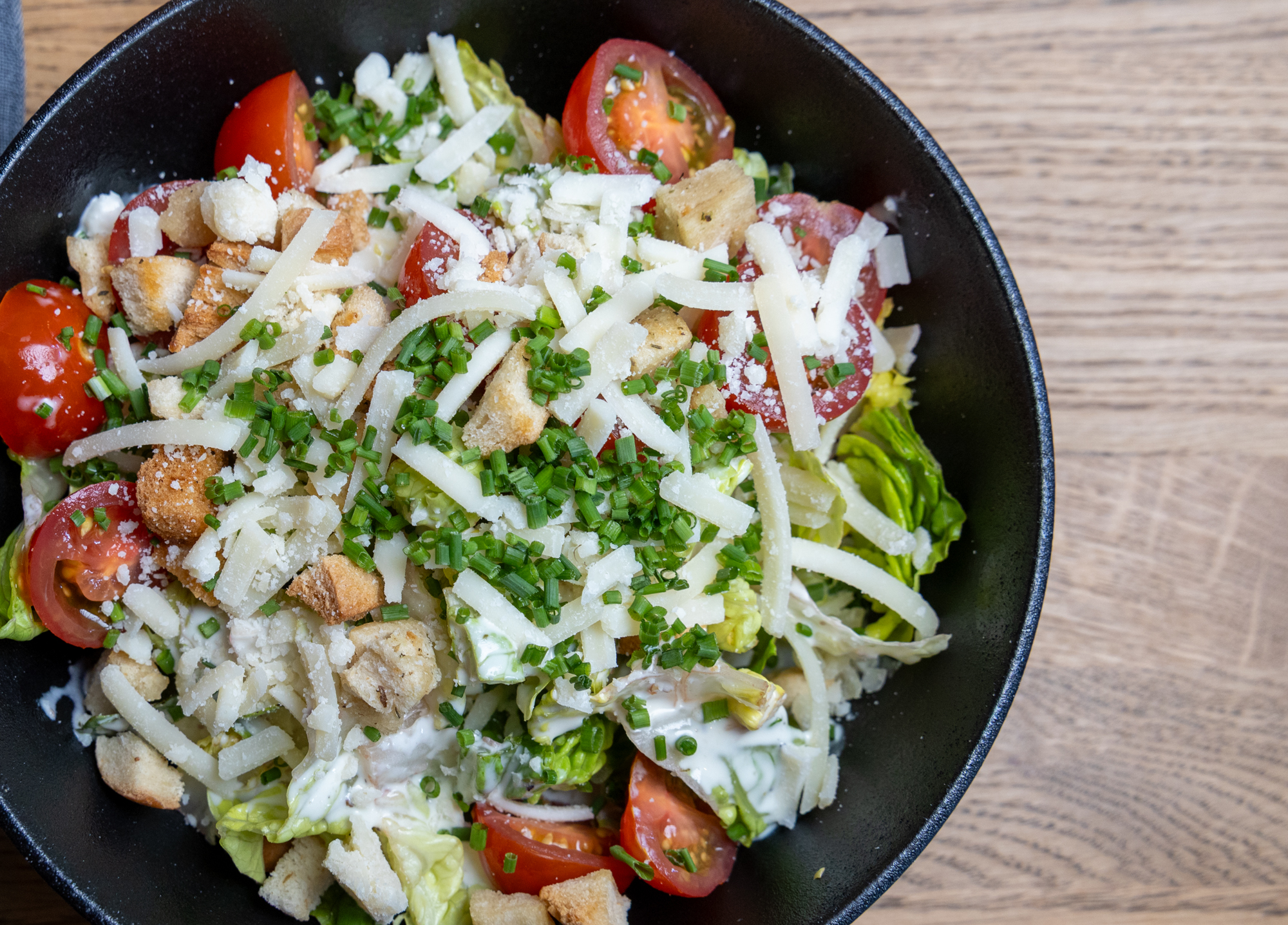 Knackiger Römersalat als Bühne für süße Kirschtomaten, gehobelten Grana Padano und goldbraune Croutons. Das selbstgemachte Caesar-Dressing verbindet Zitrusfrische, Würze und cremige Tiefe – klassisch, elegant und perfekt ausbalanciert.