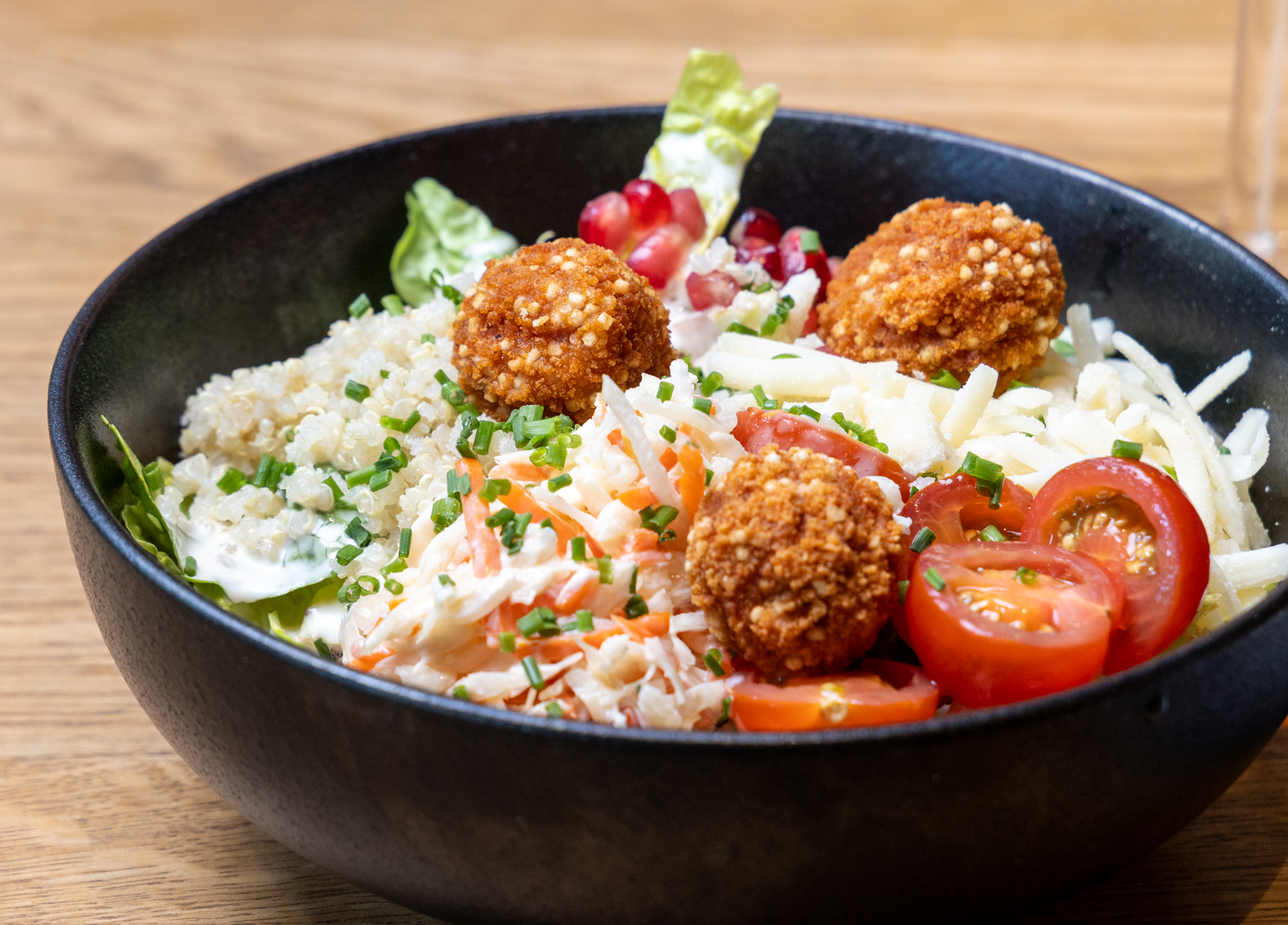 Knackiger Römersalat trifft auf cremigen Coleslaw, dazu rote-Bete-Falafel mit feiner Erdigkeit und locker gekochter Quinoa. Süße Kirschtomaten, würziger Parmesan und frische Kräuter bringen Tiefe; Granatapfelkerne setzen einen fruchtig-knackigen Akzent. Leicht, ausgewogen, angenehm sättigend.